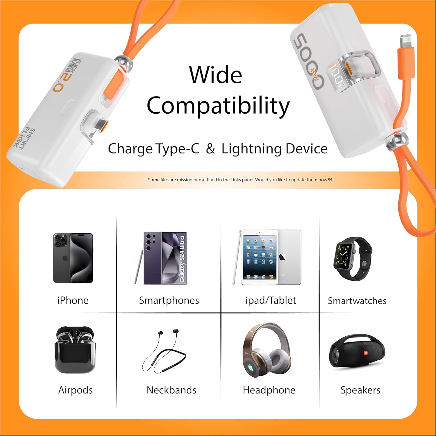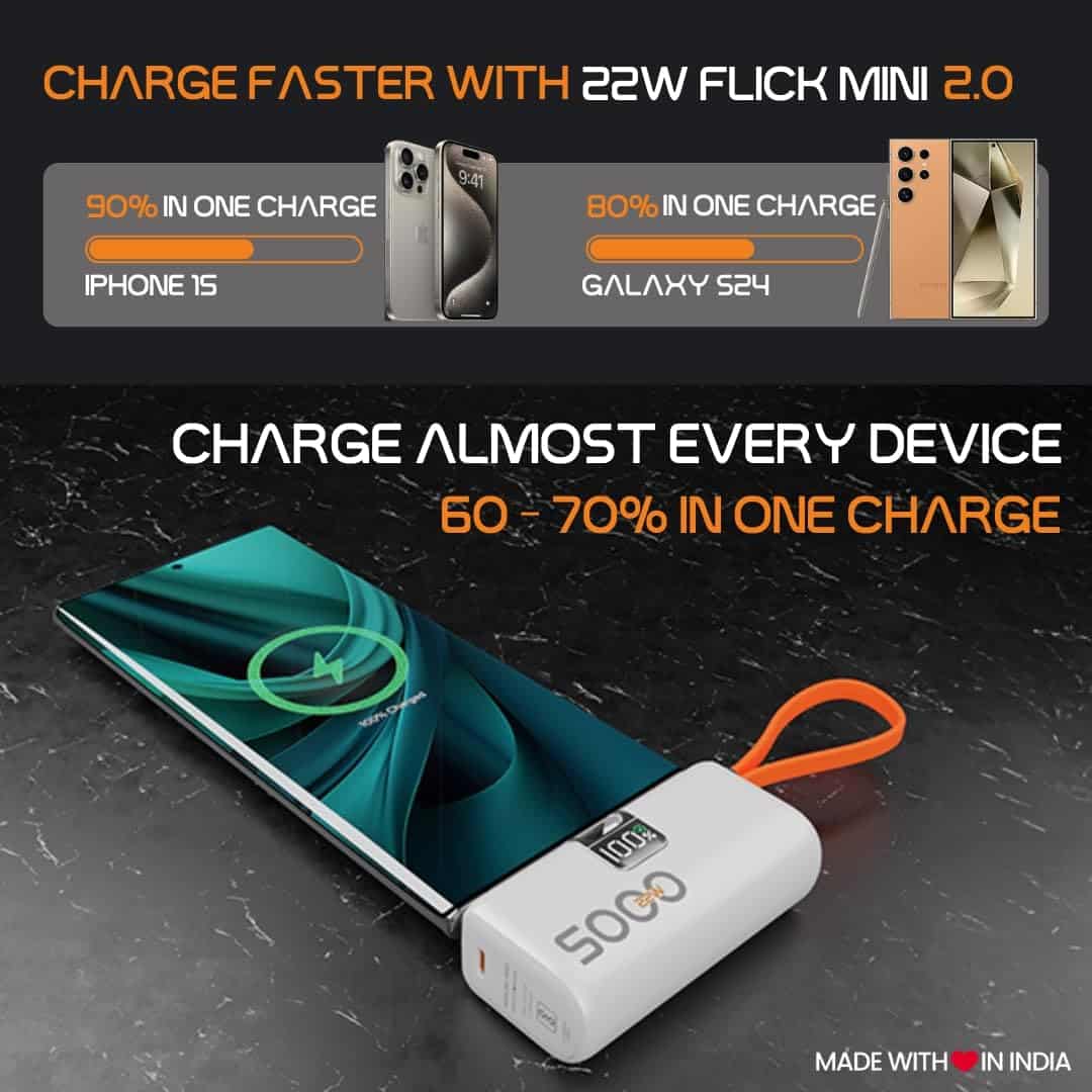 • 5000 mAh Capacity with Dual Connectors: FlickMini 2.0 offers a 5000 mAh battery with inbuilt Type-C ports, including a L-Cable for flexible connectivity. It provides a maximum output of 22W, ensuring your devices receive fast and efficient power.