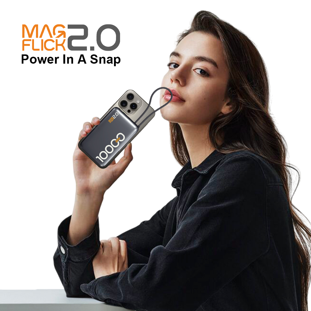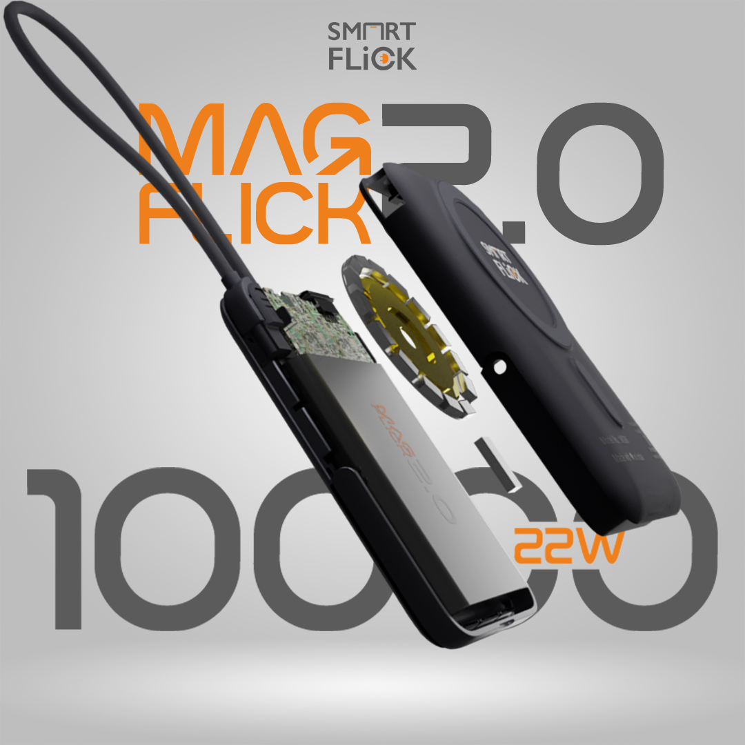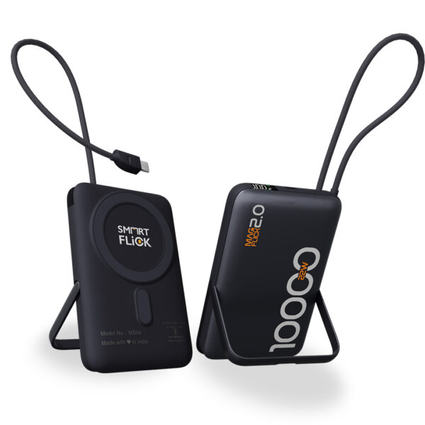 Magflick 2.0 10000Mah Power Bank With Stand, 15W Wireless Charging & 22W Wired Charging, Built-In Type-C Cable Compatible With iPhone 17/16/15/14/13 & Android Devices (Magnetic Ring Included) (Grey)