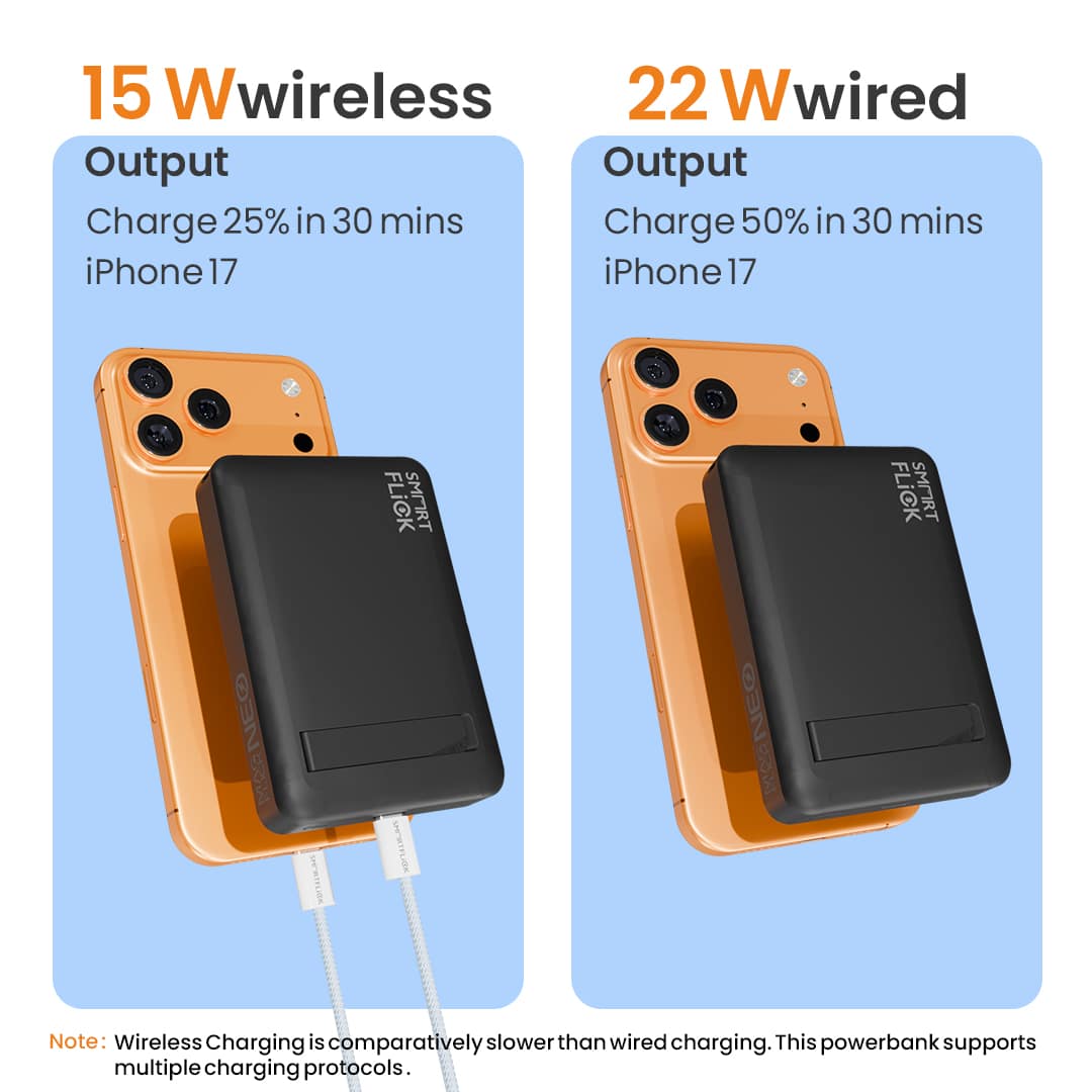 - Dual Charging Option – 15W Magnetic Wireless Charging and 22W Wired ultra-fast charging, compatible with iPhone, Samsung, Android, and other devices. Supports PD 3.0 , PPS , QC 3.0, ensuring compatibility with a wide range of devices. Power Delivery (PD) and PPS for quick charging